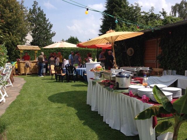 Für einen umfassenden Partyservice, köstliche Buffets und Privatveranstaltungen können Sie sich auf uns verlassen. Um Ihre Feier in kulinarischer Hinsicht einzigartig zu machen, stehen wir vom Catering TOM YAM GUNG - Thai Cuisine für Sie bereit. Natürlich bedienen wir Sie gerne direkt vor Ort, wenn Sie zum Essen bei uns vorbeikommen möchten! Machen Sie es sich an heißen Abenden in unserem atmosphärischen Außenbereich gemütlich.